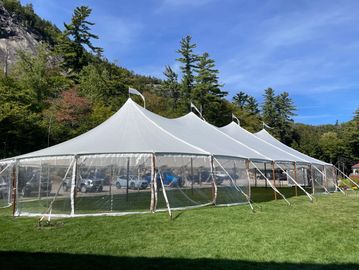The high peak frame is the best of both worlds. It has the elegant swooped look without the need of center poles. This maximizes space while keeping the traditional pole tent look. These tents can be installed with stakes or weights.